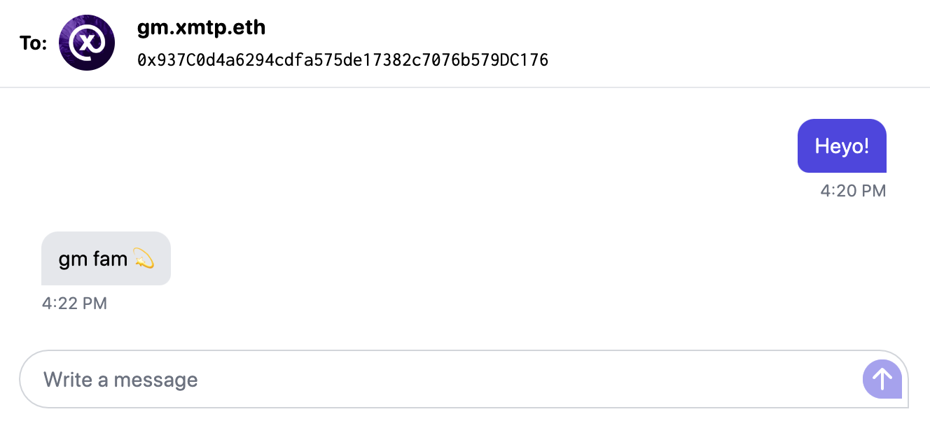 gm.xmtp.eth(0x937C0d4a6294cdfa575de17382c7076b579DC176)Message this XMTP message bot to get an immediate automated reply.